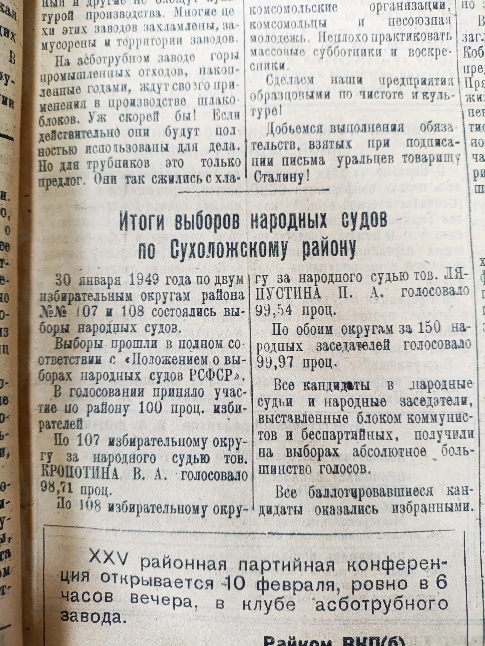 | Источник статьи: , ссылка: https://vk.com/wall-52549457_65168 ВСЕНАРОДНЫЕ ВЫБОРЫ СУДЕБНЫХ ЗАСЕДАТЕЛЕЙ В подшивке «Большевистского знамени» за 1949 год регулярно встречается любопытная информация: публично объявляется о возбуждении дела о разводе. Советские граждане и гражданки, собравшись расторгнуть брачные узы, информировали об этом общественность через газету. Дела рассматривал народный суд. А народных судей выбирали простые люди. В 1949 году 30 января в Сухоложском районе проходили выборы народных судей и народных заседателей. Им предшествовала полноценная избирательная кампания: с выдвижением кандидатов, с агитацией, с разъяснениями процедурных моментов. По итогу выборов в газете публиковались результаты. «Сегодня (…) труженики Сухоложского района идут к избирательным урнам, чтобы отдать свои голоса за верных сынов и дочерей советского народа, за кандидатов сталинского блока коммунистов и беспартийных. (…) мы избираем (...) тех людей, на которых будет возложена почетная задача стоять на страже советских законов, честно и благородно служить народу, служить Родине». ![]() |