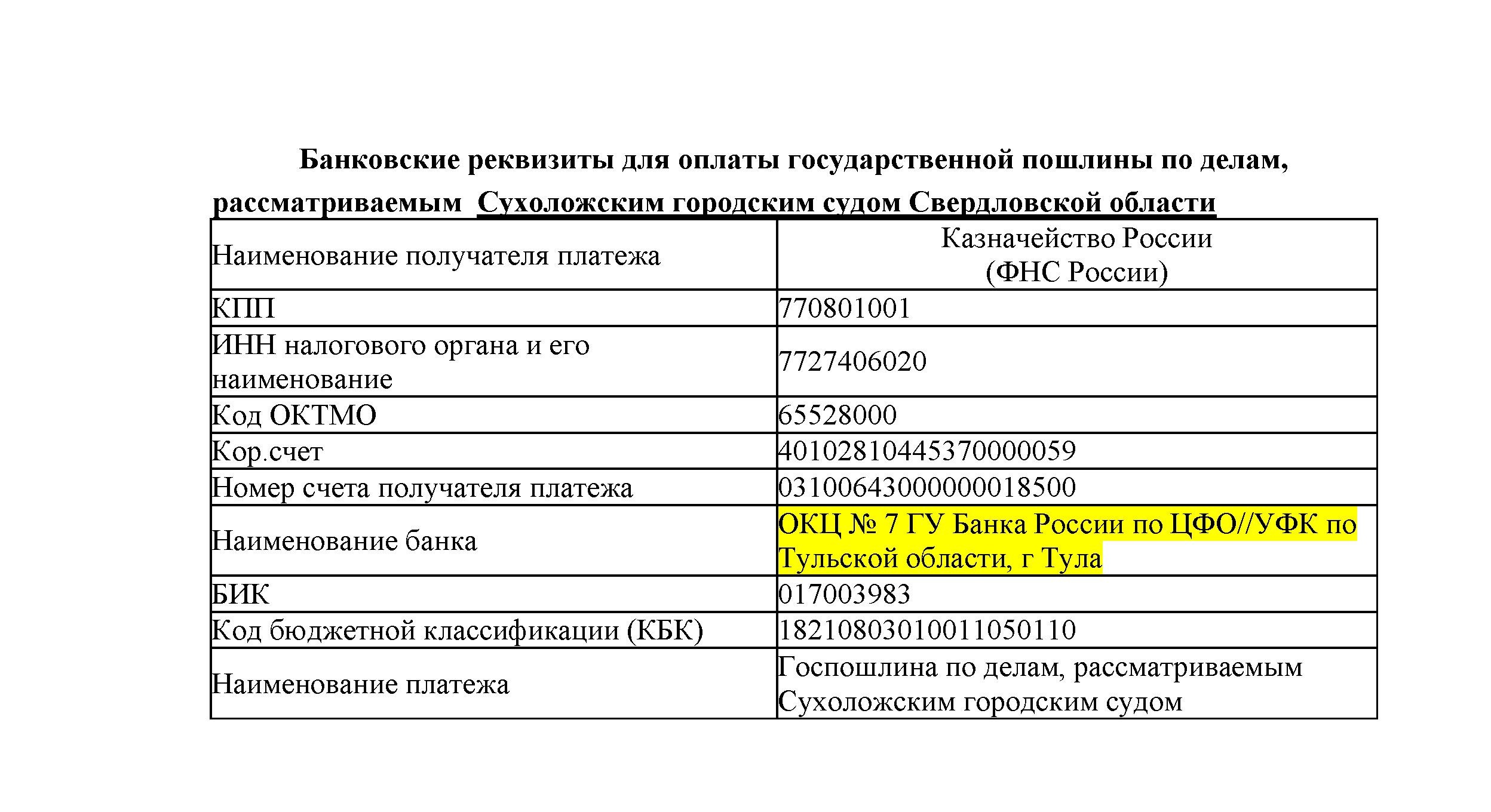 Уважаемые граждане, обращаем Ваше внимание, что с 27 октября 2025 года изменились реквизиты для оплаты государственной пошлины по делам, рассматриваемым Сухоложским городским судом, в части наименования подразделения Банка России. Для оплаты государственной пошлины в наименовании Банка необходимо указать: ОКЦ № 7 ГУ Банка России по ЦФО//УФК по Тульской области, г. Тула. Остальные реквизиты платежного документа остаются прежними. ![]() |
